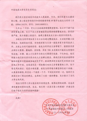09级物理一班桂良为同学表示感谢。感谢他在2010年长江防汛的关键时期,主动放弃暑期各种学习机会,深入长江抗洪抢险一线,认真排查各种安全隐患,保护当地人民群众的生命财产安全。桂良为同学的这种行为深深打动了周边群众,得到大家一致赞扬,武蛟乡党委和政府特发来感谢信,向学校和Betvictor中文