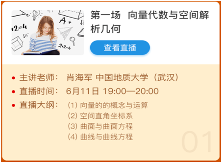为了落实“教育部关于狠抓新时代全国高等学校本科教育工作会议精神落实的通知”的精神,提高教学质量,中国大学MOOC网站特举办了“名校名师开直播——期末数学不挂科”活动。该活动主要内容有:考前重点、直播练题和互动答疑三个板块,力争通过直播互动,帮助更多的同学轻松的完成期末复习。