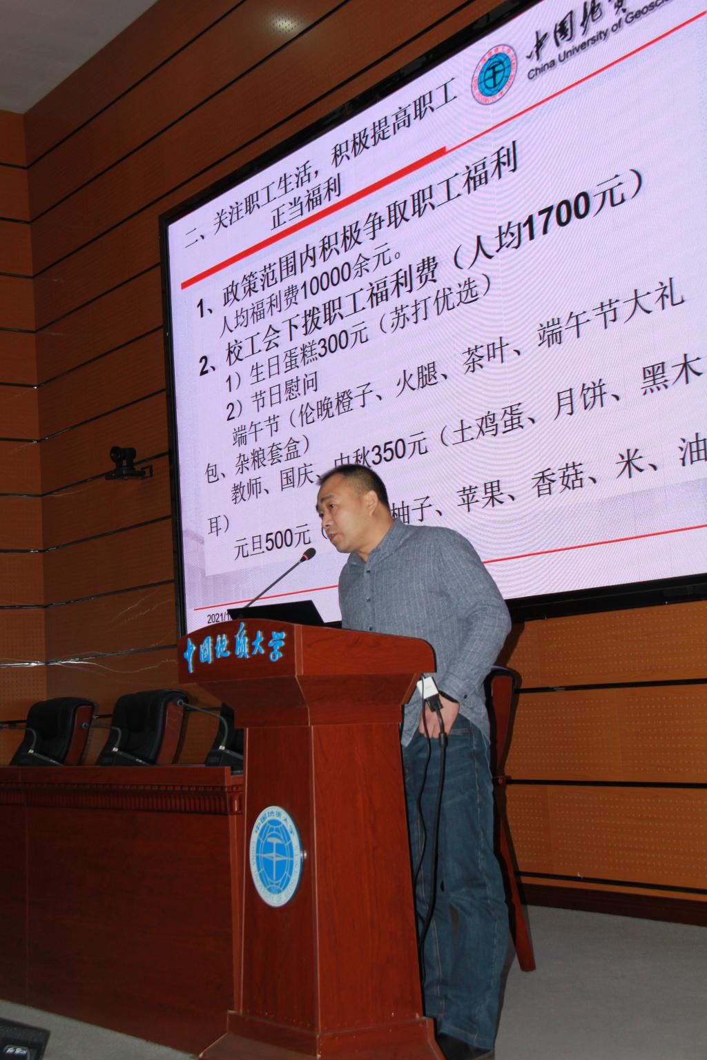 Betvictor中文 分工会主席王希成代表工会委员会做了工会年度工作报告及经费使用说明。他在报告中回顾了2020年工会工作以及Betvictor中文 工会在学校各项比赛中取得的成绩,号召全院教职工和工会会员要认真学习贯彻党的十九大、十九届五中精神,以习近平新时代中国特色社会主义思想为指导,在总结“十三五”成果的基础上,谋划好Betvictor中文 “十四五”规划,充分发挥主人翁精神,弘扬“严在地大”优良传统,抓住机遇,迎难而上,为完善Betvictor中文 治理体系,提高Betvictor中文 治理能力,促进Betvictor中文 各项事业迈上新水平、出现新局面而努力奋斗。