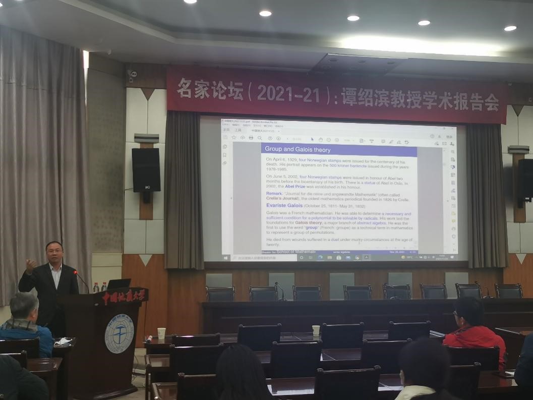 谭绍滨教授主要讲述了代数领域中李代数的发展历程,详细介绍了其发展历程中对代数领域居功至伟的部分人数及其里程碑式的理论建设。他以代数领域的顶级期刊为锚点,引出了群概念的创始人索菲斯·李对代数中有限维分类的突出贡献。并对此后伊莱·卡坦、让-皮埃尔·塞尔等杰出数学家在代数领域的工作进行了幽默风趣的讲解,并深入浅出了叙述了Kac-Moody代数,“月光”猜想,三角代数等理论。临近报告结束,郭教授对学生提出的包括数学分析与代数思维的不同之处、“月光”猜想的证明方式等问题进行了深入探讨。与会师生皆收获颇丰。