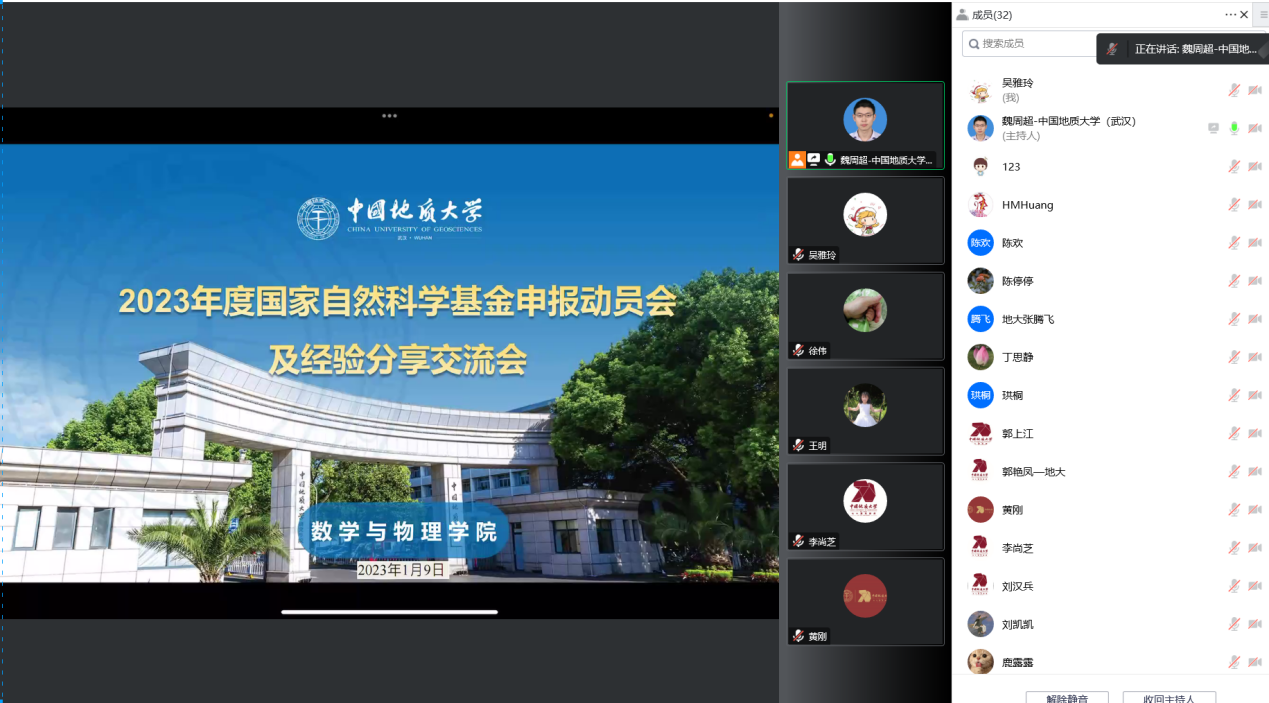 为提高国家自然科学基金项目申请质量与成效、提升Betvictor中文 科研建设水平,Betvictor中文 于2023年1月9日以线上的形式召开了2023年度国家自然科学基金项目申请动员会和经验交流会,Betvictor中文 党委书记吴太山,院长郭上江,副院长魏周超、黄刚、张保成以及Betvictor中文 40多名中青年骨干教师参加会议。会议由魏周超副院长主持。