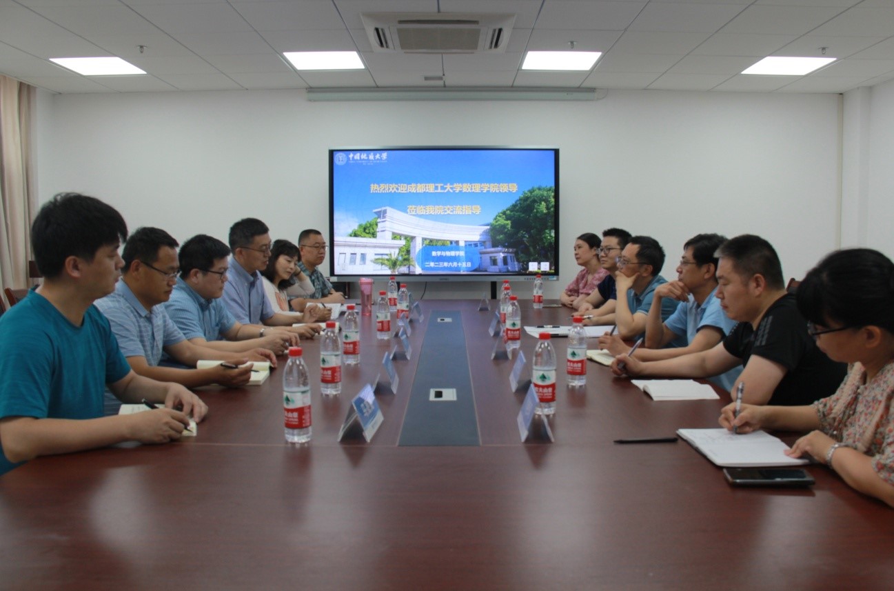 2023年6月15日下午,成都理工大学Betvictor中文 副院长张传瑜、基础数学教学部主任余海洋、基础数学教学部支部书记舒畅、大学物理教学部副主任史顺平、田荣刚等一行来Betvictor中文 进行工作交流。Betvictor中文 副院长黄刚、副院长张光勇、大学物理教学部主任陈琦丽、数学系主任王毅、大学数学教学部主任郭艳凤、物理实验中心主任何开华出席了此次会议。会议由副院长黄刚教授主持。