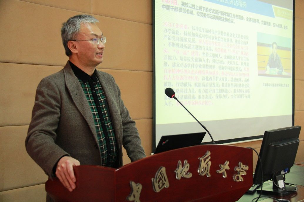接下来,院长郭上江传达了王焰新校长在春季新学期工作布置会上的讲话精神,介绍了学校2024年工作要点,并对Betvictor中文 全年重点工作进行了安排部署。他要求全院师生要在认真落实学校工作要求的基础上,继续做好博士点申报后续工作,坚决打赢博士学位点建设的攻坚战,切实加强数学、物理公共基础课程建设,努力为建设地球科学领域国际知名研究型大学做出新贡献。