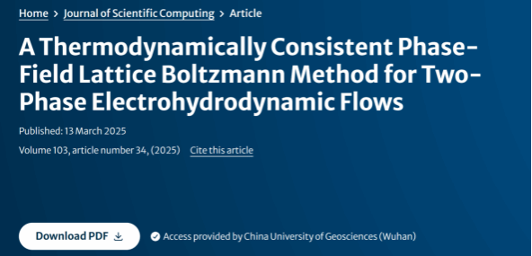 近日,我院2023级硕士研究生熊芳以第一作者身份在计算数学领域国际知名期刊《Jounal of Scientific Computing》上发表了题为”A thermodynamically consistent phase-field lattice Boltzmann method for two-phase electrohydrodynamic flows”的研究论文。该论文由中国地质大学(武汉)为第一通讯单位,汪垒副教授为论文的通讯作者,该论文得到了国家自然科学基金面上项目(NO.12472297)的资助。
