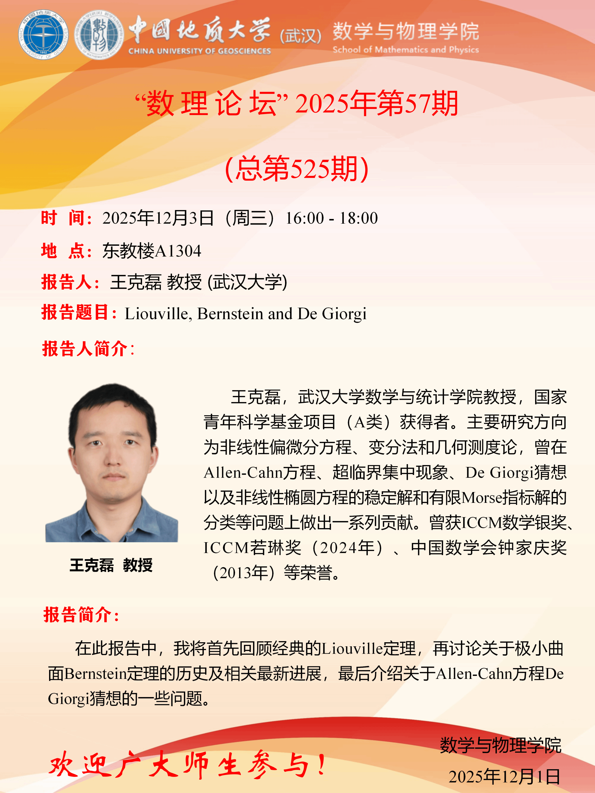 2025年12月3日王克磊教授学术讲座:Liouville, Bernstein and De Giorgi