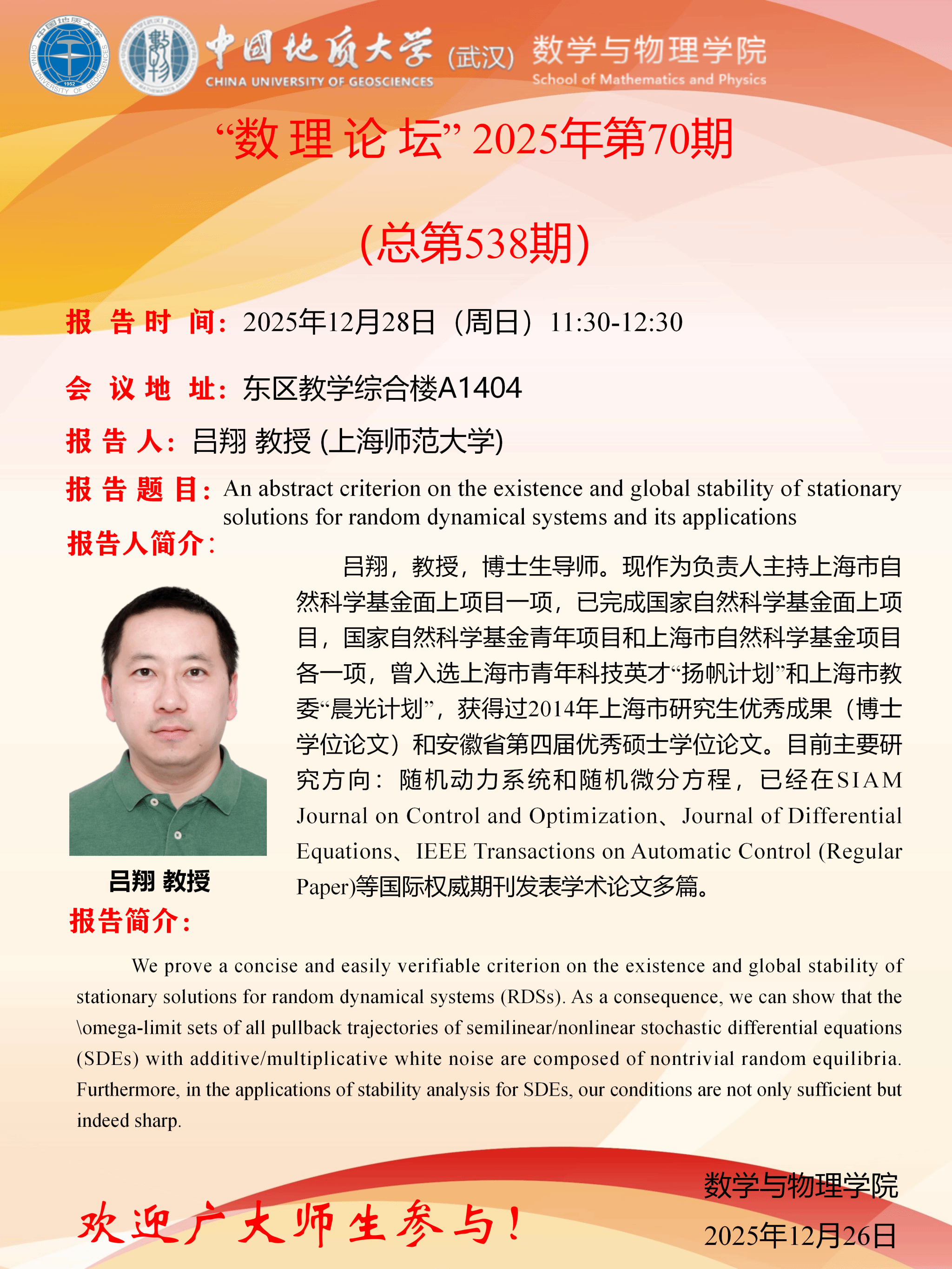 2025年12月28日吕翔教授学术讲座:An abstract criterion on the existence and global stability of stationary solutions for random dynamical systems and its applications