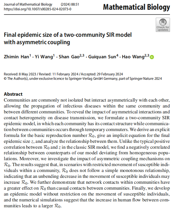 近日,Betvictor中文 2021级博士生韩志敏以第一作者身份在国际生物数学主流期刊《Journal of Mathematical Biology》上发表题为“Final epidemic size of a two-community SIR model with asymmetric coupling”的学术论文。该论文第二作者为指导教师王毅副教授,通讯作者为加拿大数学生态学和流行病学跨学科实验室主任、阿尔伯塔大学数学与统计科学系王皓教授。