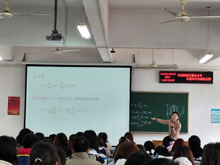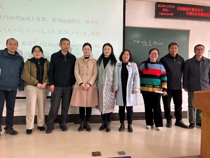 2023 11 27 日,在大学数学教学部组织下,大学数学教学部多名教师在北综楼101现场观摩了陈兴荣老师的高等数学公开课。老师多媒体与板书完美结合,授课手段使用合理有效。授课中,陈老师通过精心设计例题,丝丝入扣,教学环节衔接自然,语言准确,讲解清晰明了,将枯燥的概念讲得深入浅出,通俗易懂,启发式教学引导学生思考、分析问题,积极参与教学活动,课堂师生互动充分,整个课程气氛活跃,达到了很好的教学效果,陈老师的授课得到了观摩教师们的一致好评。