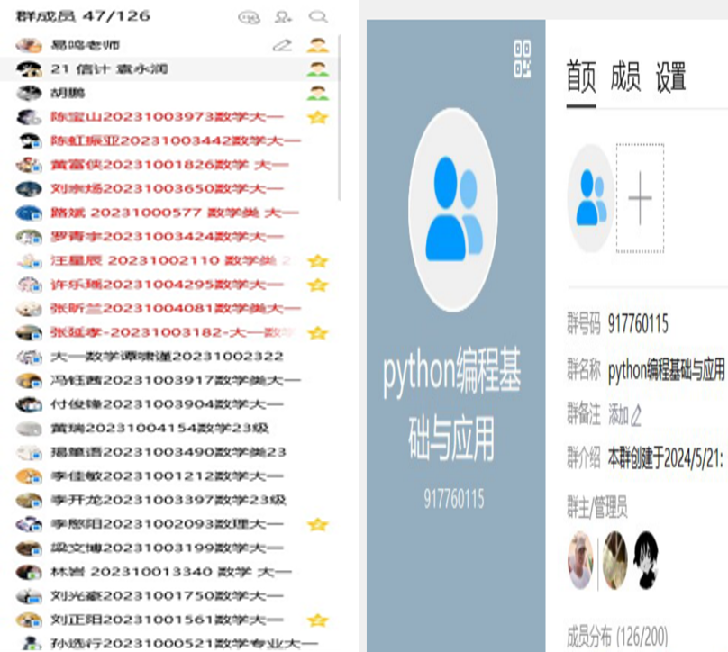 日前,第一轮实习实训课正式开始实施,面向120余位2023级数学大类本科生的实践课《Python编程基础与应用》,于2024年7月2日-4日进行了集中授课和培训。培训前,易鸣老师为每位同学分配了登录账号和学习资源,让同学们提前了解教学目标、教学内容、实训平台等。在为期三天的在线集中培训过程中,通过结合教师线上授课+工程师线上授课+教师工程师线上答疑+同学们在线自主学习+QQ群讨论交流,整个培训课程取得了良好的效果。胡鹏老师介绍了平台资源、平台使用、作业规划,泰迪科技工程师围绕大数据教学管理平台、数据挖掘建模平台、数据可视化平台等进行了细致说明。同学们远程登录“智能计算与应用数学”实习实训平台进行自主学习,通过知识学习—算法了解—数据下载—案例分析,亲身体验,激发兴趣,同时完成相关课程的实训练习和课程报告。2023年全国大数据分析技能大赛Python数据分析本科生组全国总决赛二等奖获得者、信息与计算科学专业2021级本科生袁永润同学,很热心的为学弟学妹答疑解惑。