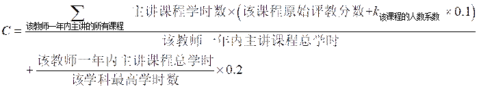 学生评教后,考虑到教师任课门次、课时长短、选课人数都有不同,再通过以下公式计算出该老师的综合学生评教分(计算时按数学学科和物理学科分别计算,且下面提到的课程均指纳入评教范围的本科生课程):